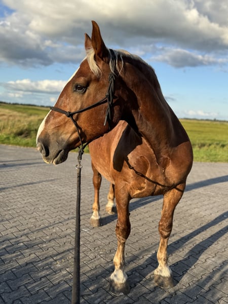 Met pijn in het hart zoek ik voor mijn geweldige ruin Max een nieuw thuis. Max is een Zuid-Duitse koudbloed van nu bijna 7 jaar oud, met een stokmaat van ongeveer 1,68 m. Hij overtuigt vooral door zijn uitzonderlijk vriendelijke, open en rustige karakter. Max is zeer mensgericht, nieuwsgierig en in de omgang absoluut probleemloos. Een echte knuffelbeer. Vorig jaar is hij op zesjarige leeftijd voorzichtig zadelmak gemaakt en toonde vanaf het begin zeer coöperatief en volledig ontspannen. Na slechts enkele weken ging hij betrouwbaar de buitenritten aan. Max wordt momenteel recreatief gereden, kent dressuurwerk en houdt vooral van buitenritten. In het terrein toont hij zich als een uiterst betrouwbare partner. Hij is ijverig, beschikt over goede basisgangen en is geen traag paard. Hij heeft plezier in alle vormen van werk en staat voor alles open (vrijheids- / grondwerk, dubbele longe, rijden, buitenritten etc.). Hij is momenteel vierkant beslagen, maar dit is enkel omdat hij op geplaveide oppervlakken en kunstgras staat, waar de slijtage anders te groot is. Hoefijzers zijn verder absoluut niet nodig. Hij kent de smid, dierenarts, trailer rijden en toont zich daarbij altijd onbevreesd en kalm. Max is gezond en heeft geen bekende aandoeningen. Hij staat momenteel in een openstal / actiefstal in een grote kudde en is zeer goed te combineren met andere paarden. Hij kent gemengde kuddes evenals ruwe hengstenkuddes. Max wordt uitsluitend afgestaan wegens gebrek aan tijd, omdat ik twee paarden heb en niet meer aan hem kan voldoen. De verkoop gebeurt alleen als alles echt klikt, aangezien het geen noodgeval is. Hij wordt alleen in goede handen geplaatst. Aanvragen van handelaren etc. worden niet beantwoord.