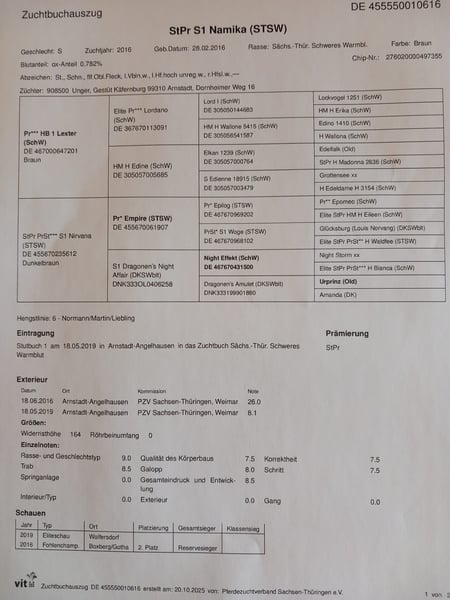 Namika überzeugte schon als Fohlen und wurde Reservesiegerin beim Fohlenchampionat. Sie ist eingetragen Staatsprämienstute und erhielt die Noten 9,0 für Rasse und Geschlechtstyp sowie 8,5 für ihren Trab. Ihre Zuchtstutenprüfung absolvierte sie mit dem Gesamtergebnis von 7,74. Dabei beeindruckte sie beim 21 Tage Training mit ihrer Umgänglichkeit (9,0), Leistungsfähigkeit (9,0), Zugmanier (9,0) und Arbeitswilligkeit (9,0). Namika wird bei uns derzeit freizeitmäßig geritten. Gefahren wurde sie seit der Leistungsprüfung nicht mehr. Namika wurde am 1.5.2025 mit Centurio gedeckt und ist tragend. Namika hatte bereits ein braunes Hengstfohlen und ein schwarzes Stutfohlen. Sie wird wegen Bestandsverkleinerung verkauft.