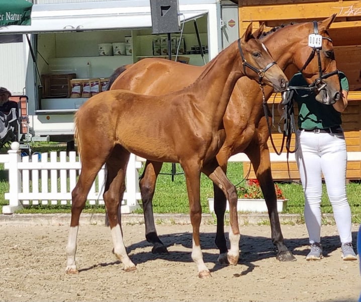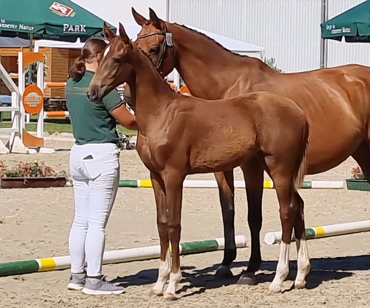 This beautiful and very correctly built dressage mare was born on March 23, 2025. She is an exceptional specimen - long-legged, elegant, chestnut, and with four white socks. She is an embryo transfer foal from the famous Vitalos. Her mother, Quality Time, is 10 years old this year and an Oldenburg elite mare - pedigree: Quantensprung/Placido. Quality Time has been successfully competing in dressage for years and has won all her tests in 2025 so far. M**, S*, and S** victories all with scores of 69-70%. She is currently nearly S*** ready and will make her debut at this level this season. Quality Time was also qualified for the Bundeschampionat as a 5-year-old. With this beautiful and talented filly, you are securing the future! The sale is directly from the breeder. The mother is also with us and can be viewed. !! The mare with which the foal is at foot is not the genetic mother but a surrogate mother. The ridden black mare in the videos/pictures is the genetic mother. Additionally, we are selling a full brother to this foal, born on March 10, 2025.